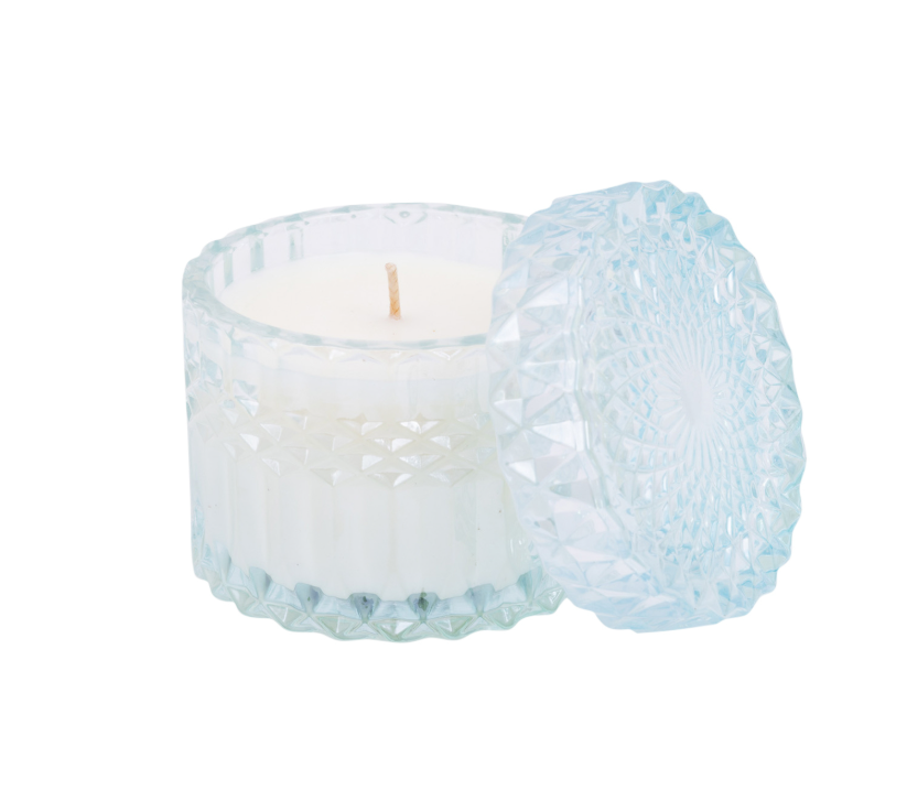 Every vessel includes a matching glass-cut lid—adding elegance, sophistication, and protection from dust and debris. Each fragrance in the Shimmer Collection is paired with a unique art deco–inspired glass hue, chosen to reflect the essence of the scent within.