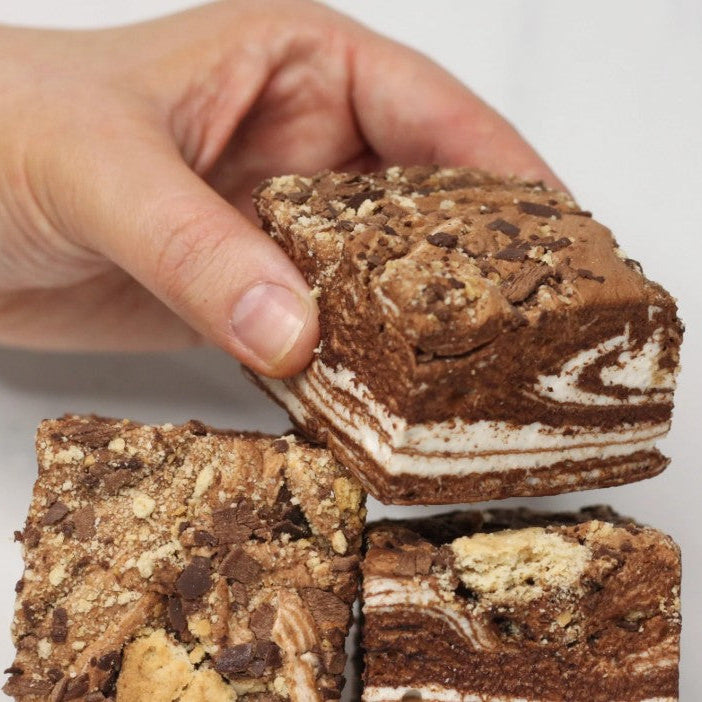Introducing the new and improved S’mores Marshmallows! A delicious swirl of chocolate and vanilla bean marshmallow, generously loaded with decadent dark chocolate flakes and chunky pieces of graham cracker. Sweet, indulgent and seriously yum!