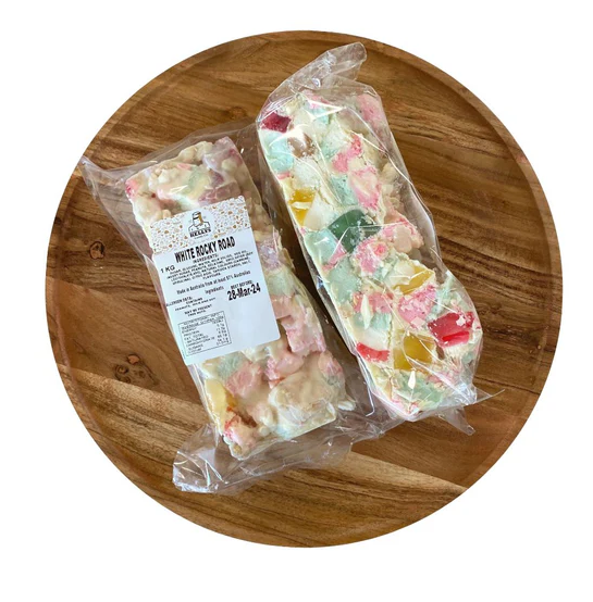 This chunky, chewy, chocolatey masterpiece starts with our handmade, fluffy marshmallow, poured over our signature jellies for the perfect mix of soft and sweet. We then chop up this jellymallow delight, toss it with crunchy peanuts, and smother it all in silky milk chocolate before setting it into a massive 1kg slab.